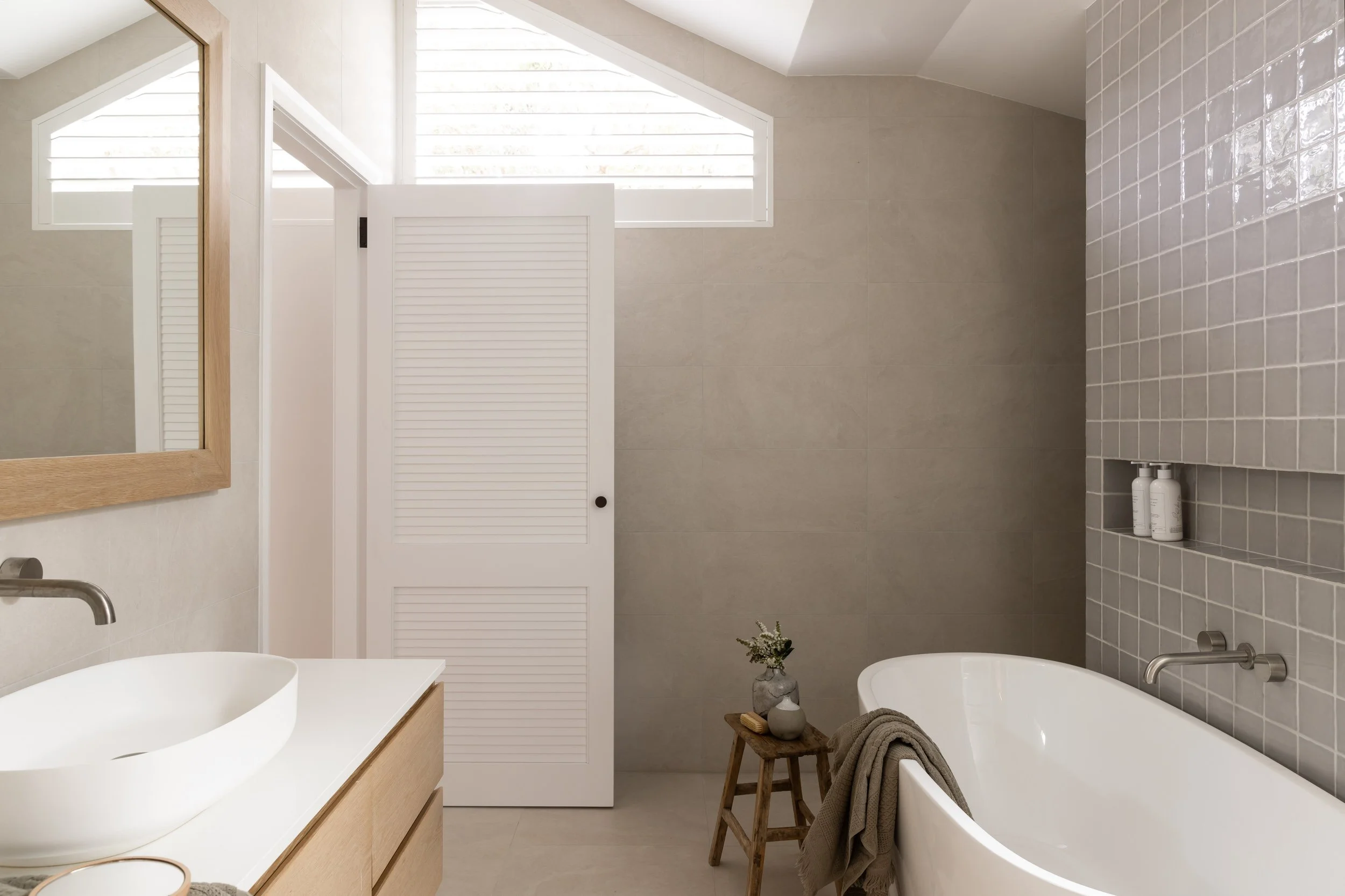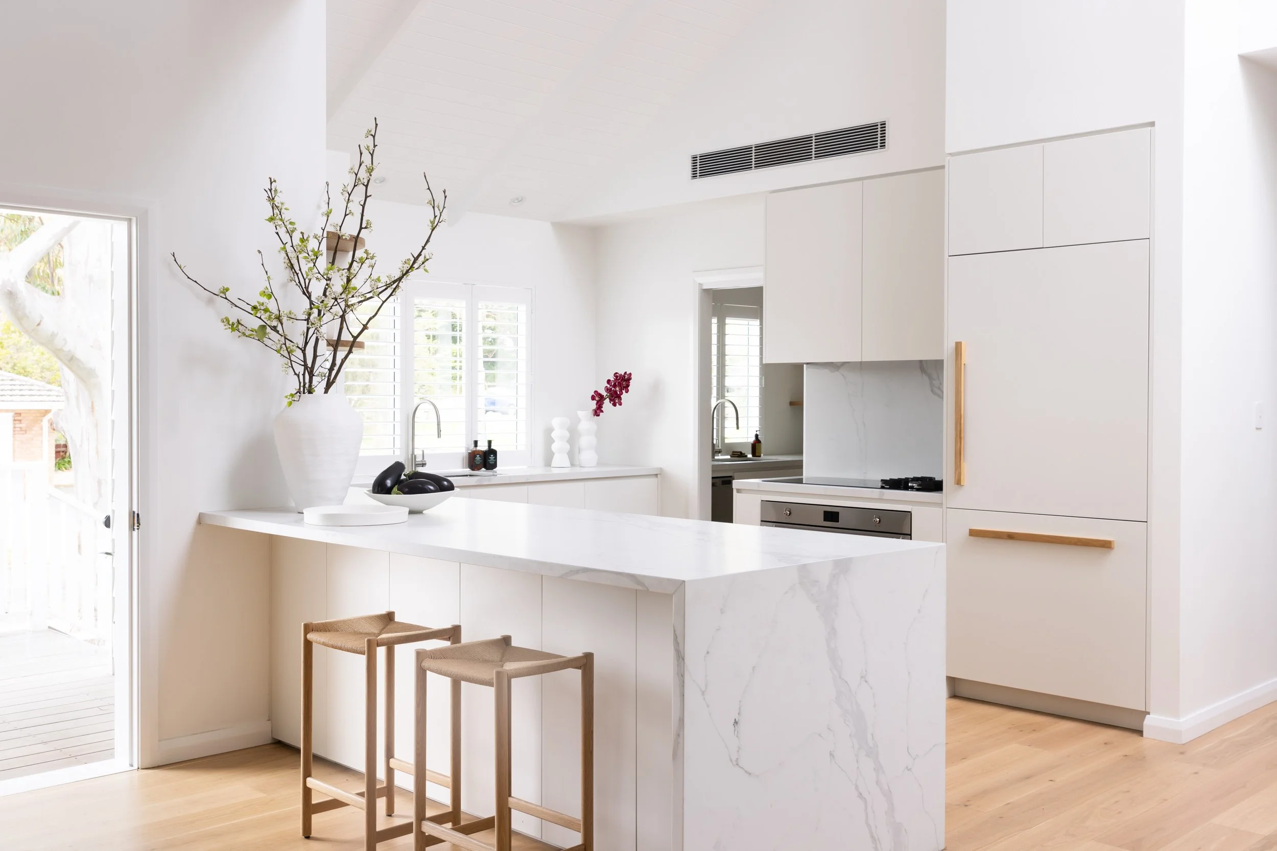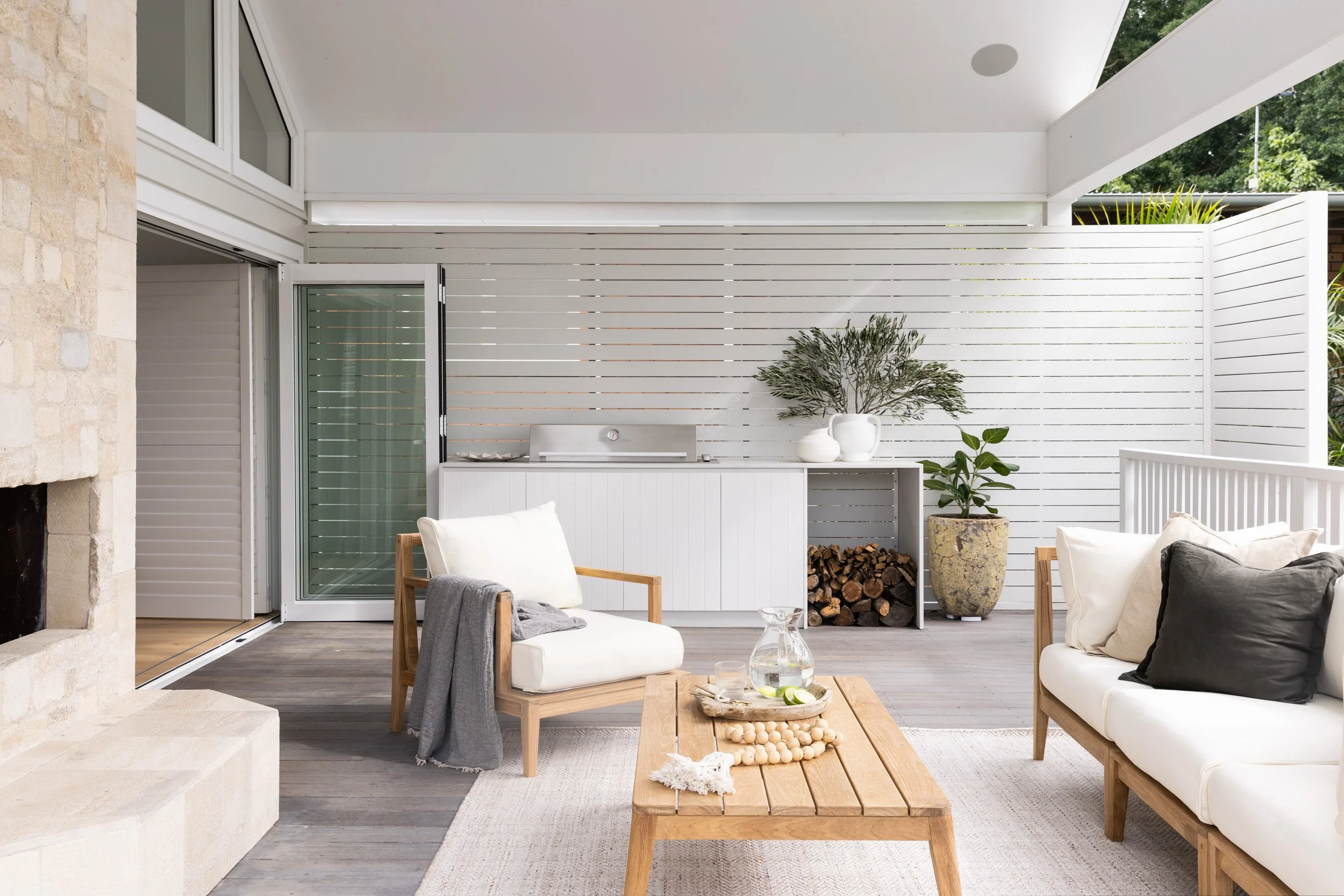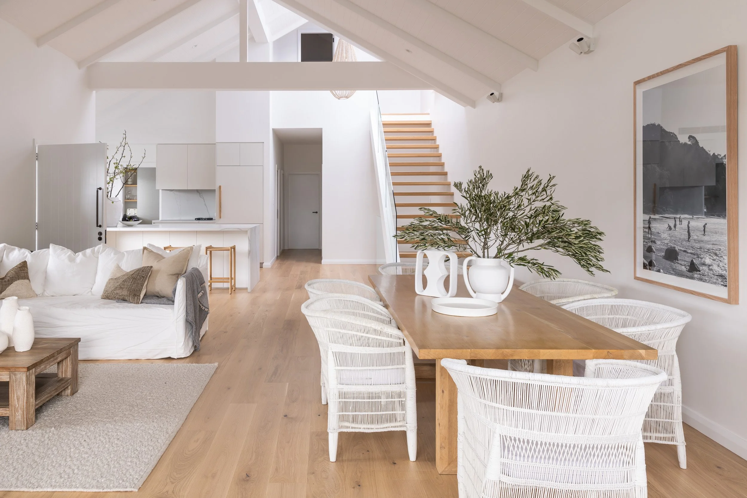 We incorporated cathedral ceilings to bring in natural light and create a sense of space, while an indoor-outdoor fireplace anchors the main living zone. Custom joinery runs throughout the home, adding storage and flow. Outside, a large entertainer’s deck and outdoor shower make the most of the coastal location. The interior finishes—soft whites and natural tones—keep the spaces feeling calm, clean and easy to live in.