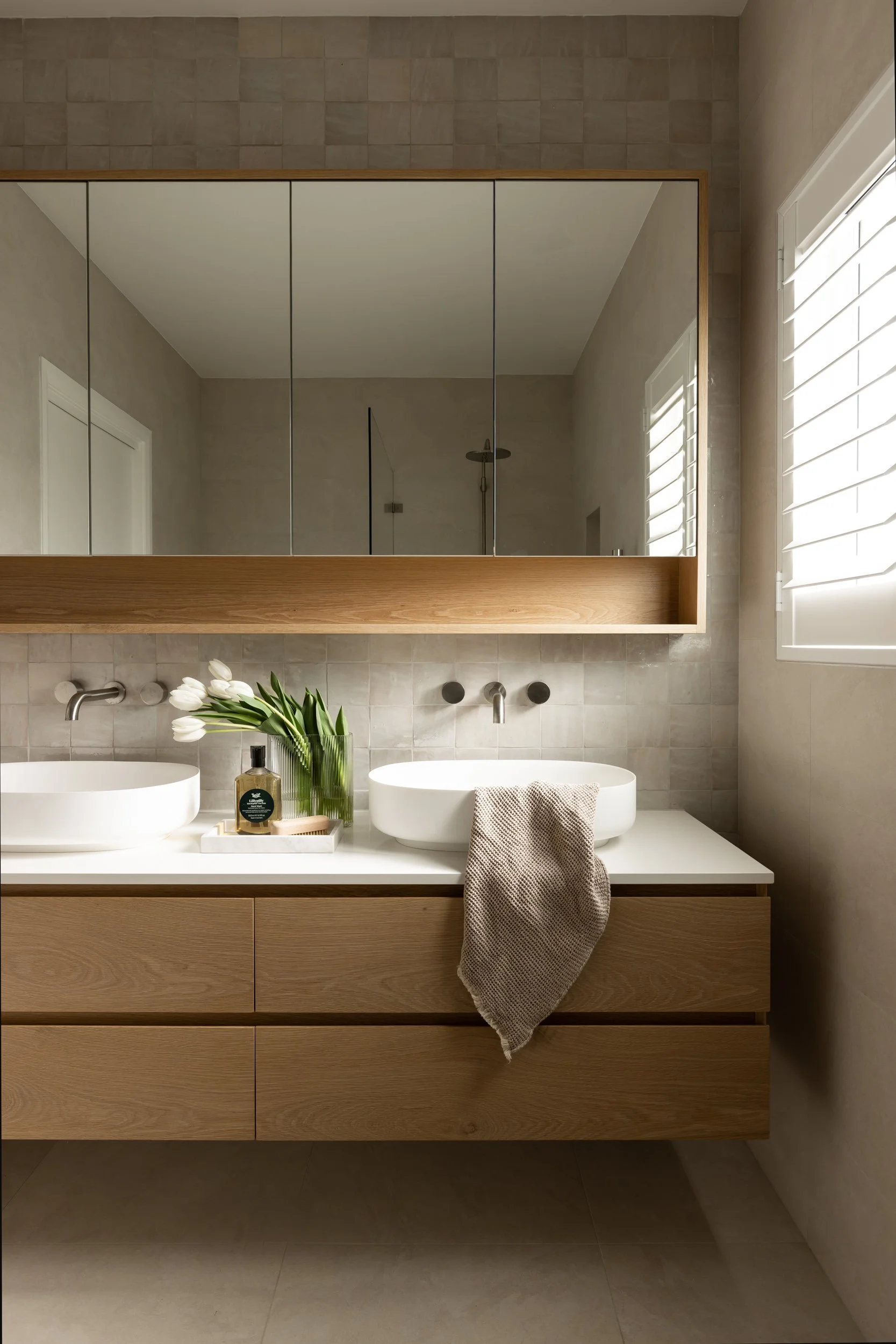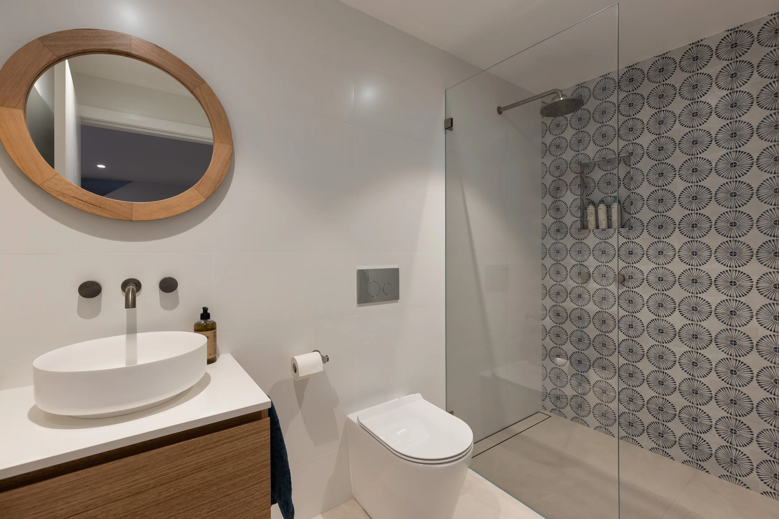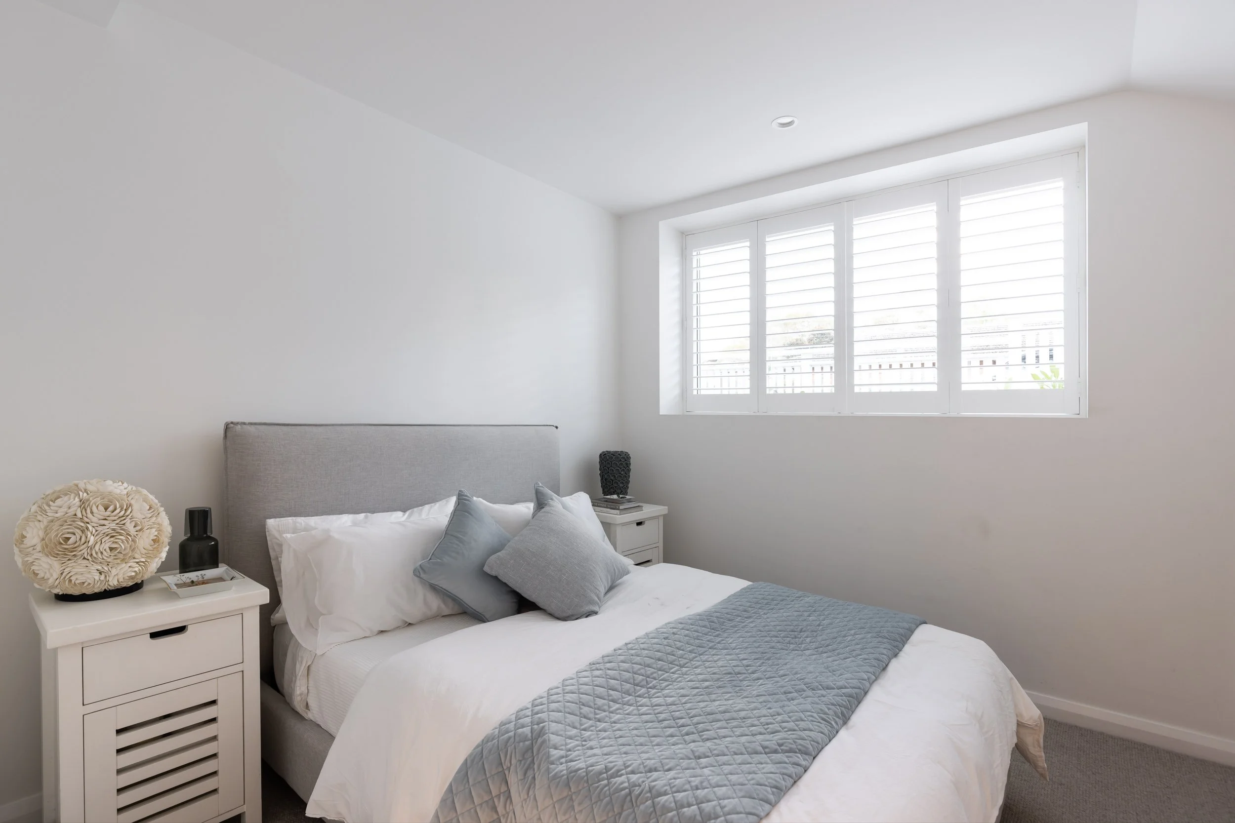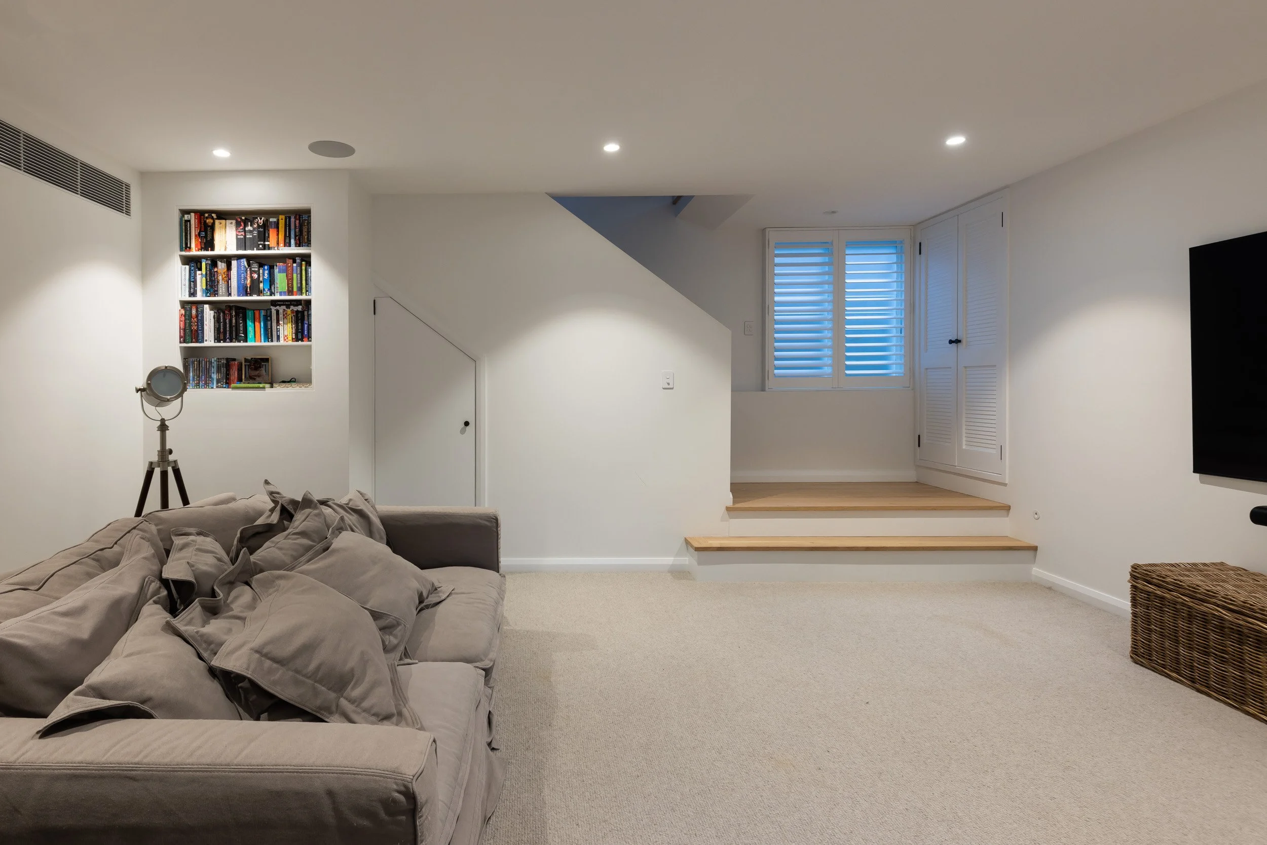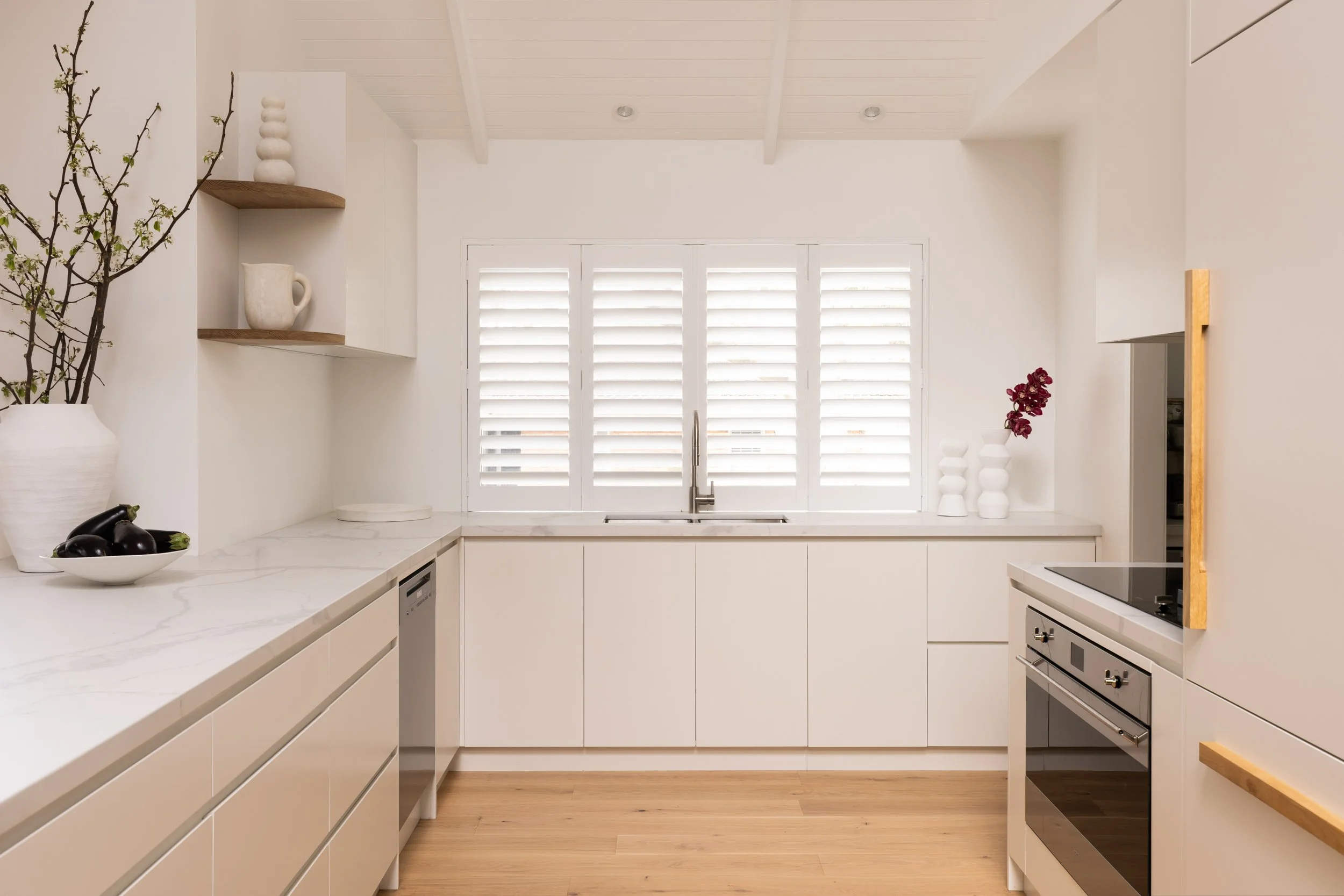 We incorporated cathedral ceilings to bring in natural light and create a sense of space, while an indoor-outdoor fireplace anchors the main living zone. Custom joinery runs throughout the home, adding storage and flow. Outside, a large entertainer’s deck and outdoor shower make the most of the coastal location. The interior finishes—soft whites and natural tones—keep the spaces feeling calm, clean and easy to live in.